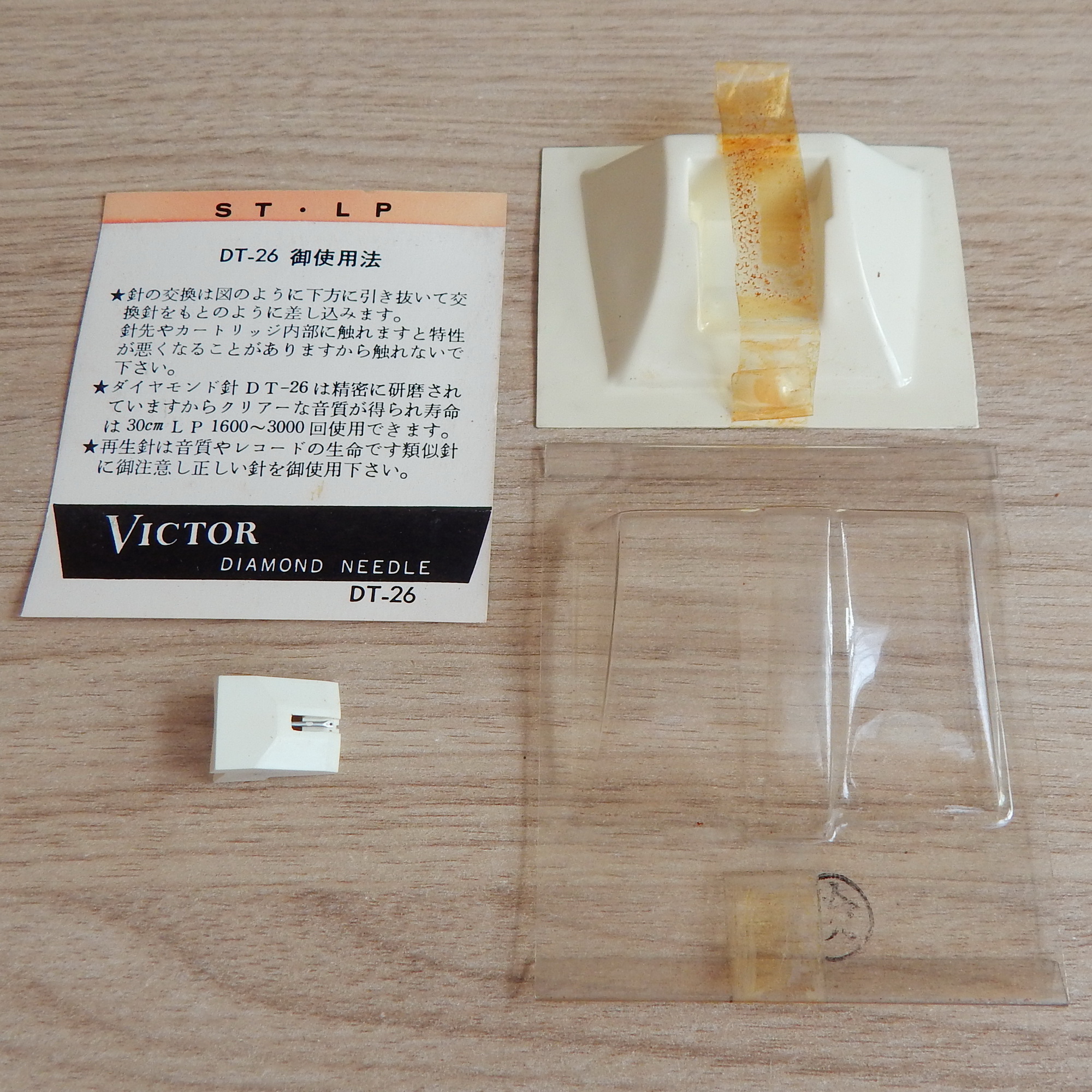 Иголка (вставка) Victor DT-26 оригинальная, Япония. Без следов эксплуатации, с завода вставка шла прикрытая скотчем - на фото 3 он еще виден, высох, я его удалил. Вставку почистил на очистителе стилуса Audio Technica AT-637, визуально кантилевер и игла чистые, без окислов.