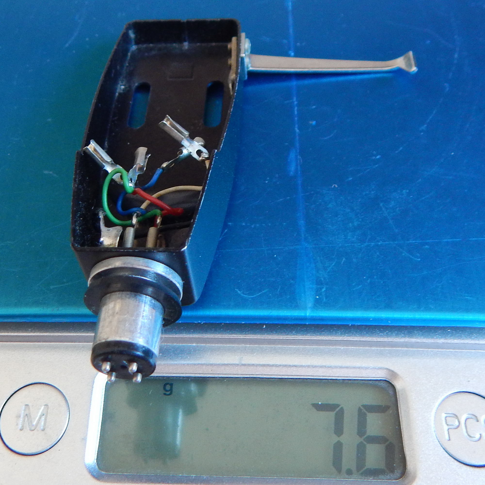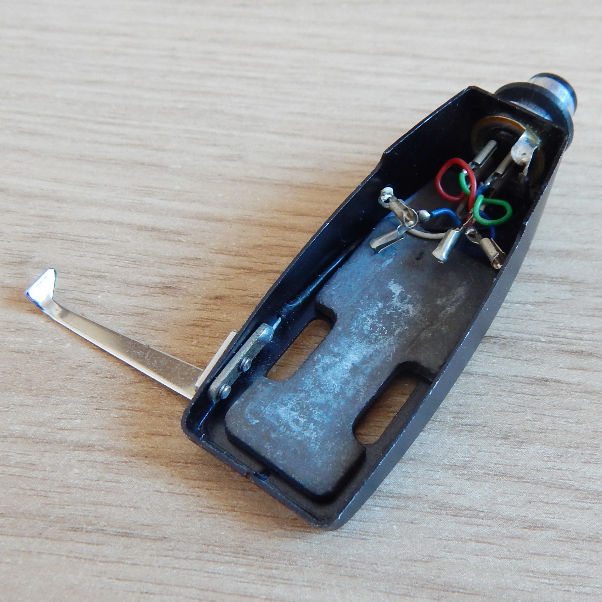 Шелл Kenwood (Trio) с логотипом, примерно 1969 г. выпуска, 7,6 гр., черный металлический, с проводами + массивная свинцовая прокладка габаритом 35х18 мм, толщиной 2,5 мм, вес 14,3 гр., Япония. На шелле стоял картридж Kenwood V-31. Такой шелл и головка стояли на TRIO PC-250