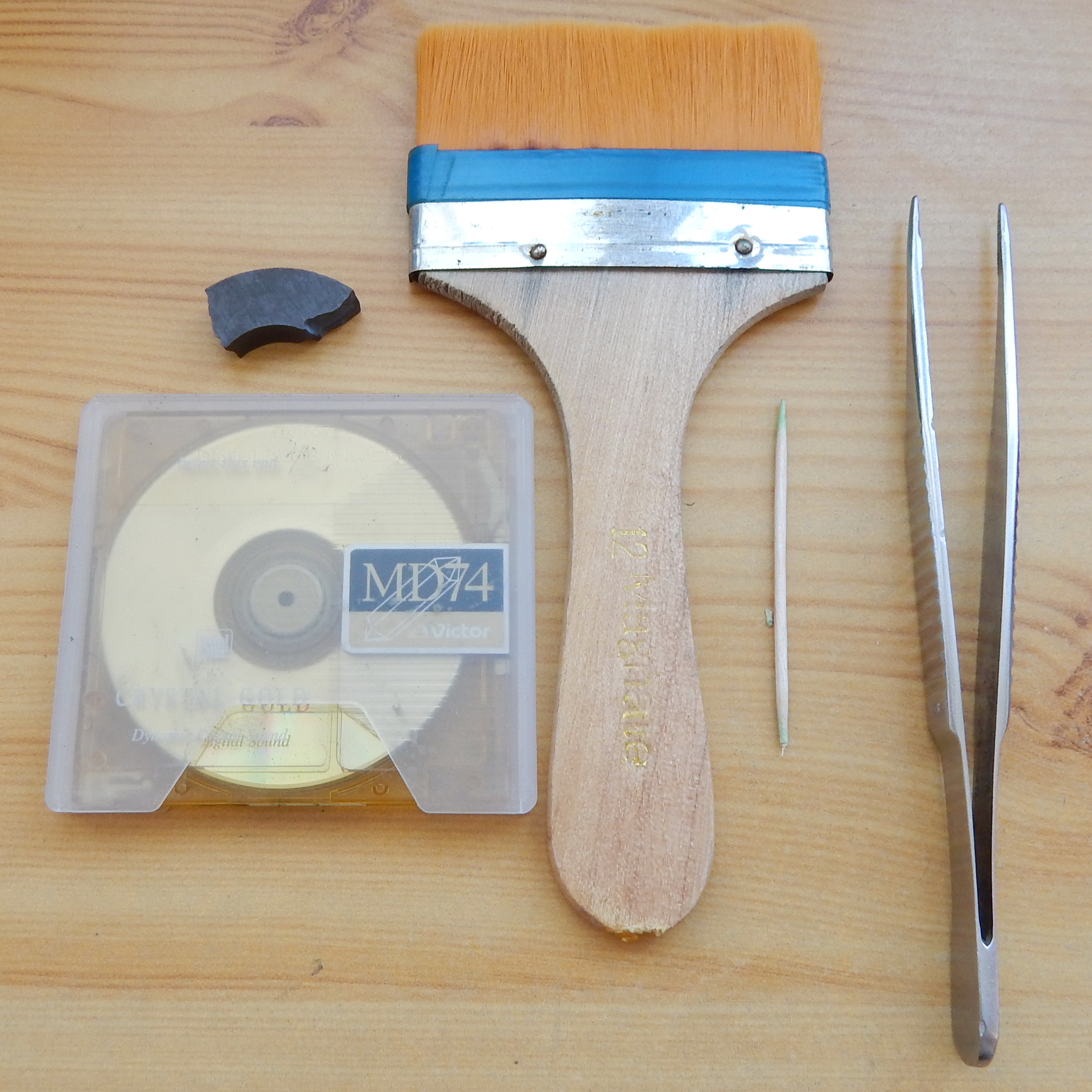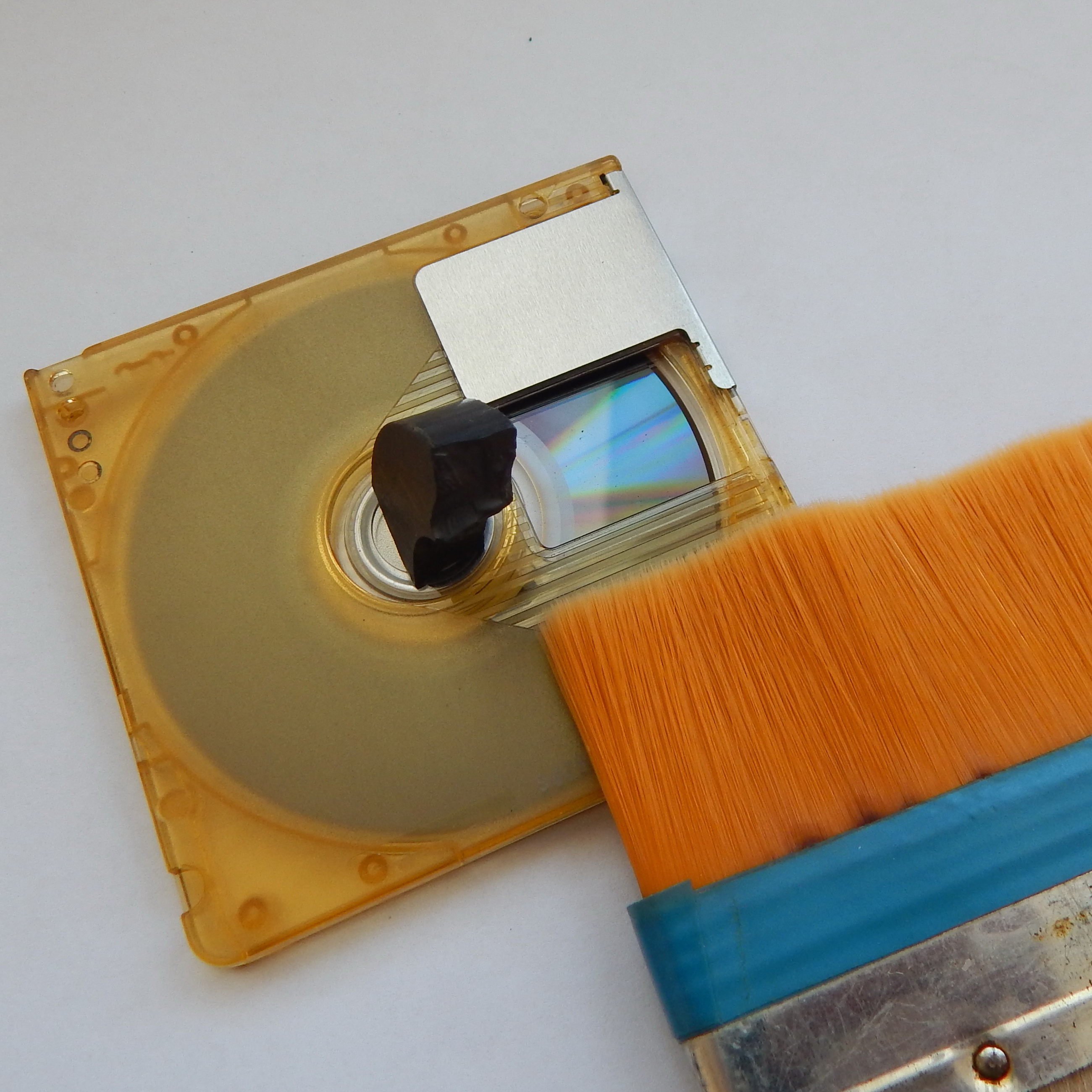Защитную шторку минидиска можно сдвинуть - с помощью зубочистки нажать на стопор шторки (фото 4). Диск удобно вращать с помощью небольшого магнита (фото 5). Если увидите на поверхности диска посторонние загрязнения, сдуйте их или удалите кисточкой. Если будет явная грязь - удалите ее чуть влажным ватным тампоном, потом протрите это место насухо. Я смачивал тампон водой, изопропилом не пробовал. Мелкая пыль, которая неизбежно появляется на поверхности диска за время хранения, в процессе его эксплуатации сдуется сама.