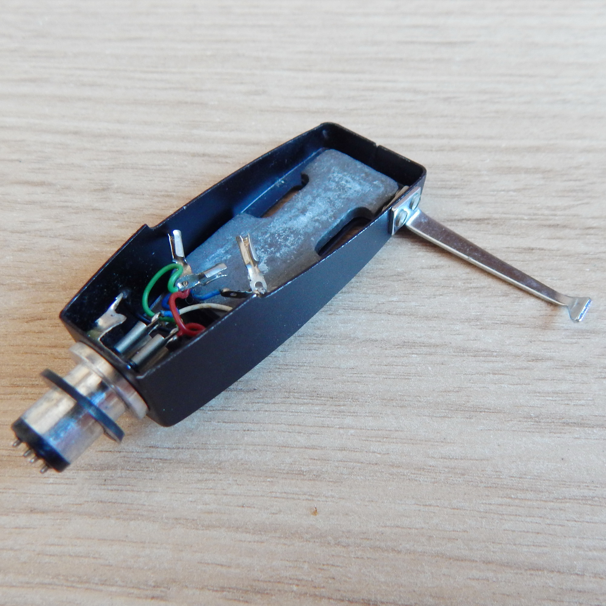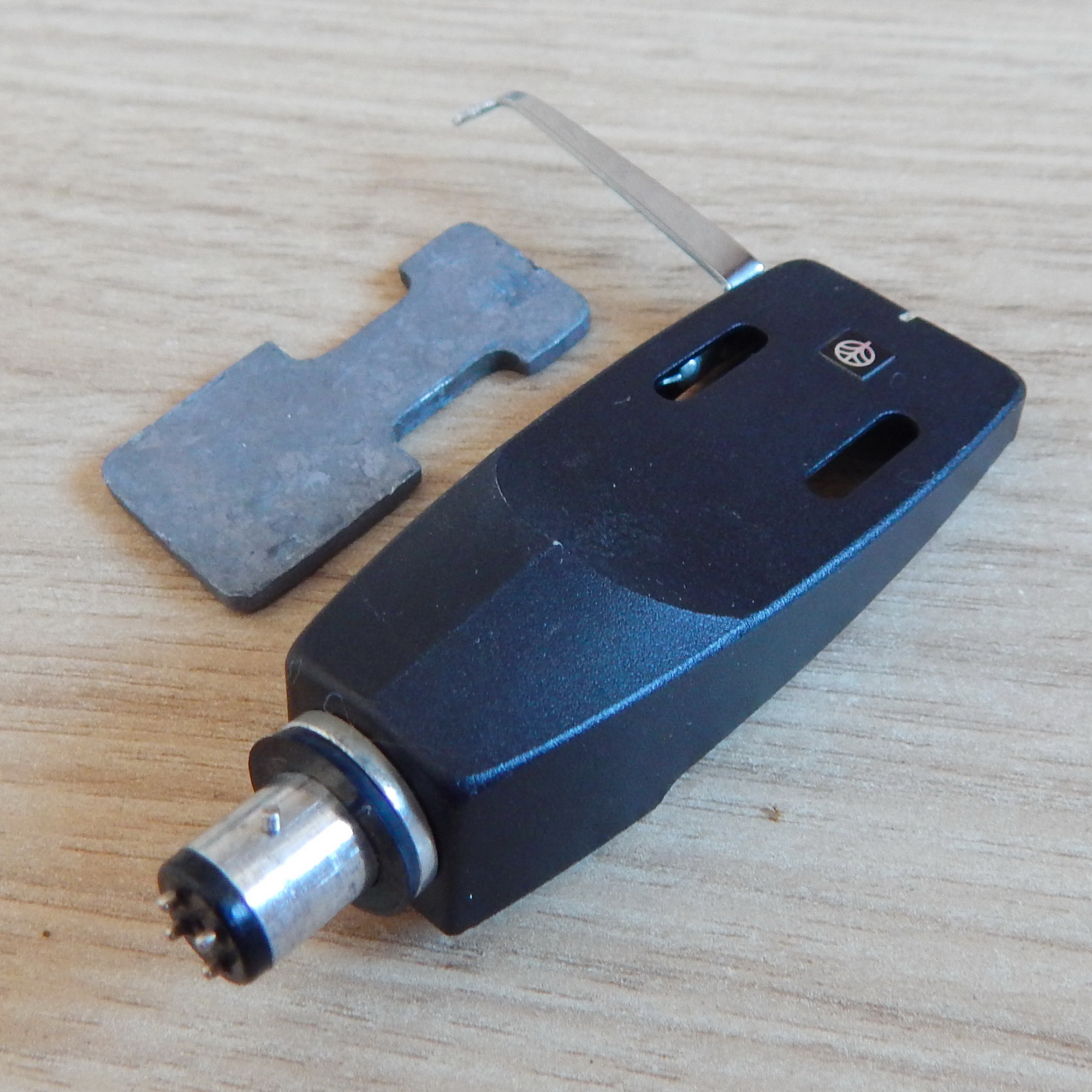 Шелл Kenwood (Trio) с логотипом, примерно 1969 г. выпуска, 7,6 гр., черный металлический, с проводами + массивная свинцовая прокладка габаритом 35х18 мм, толщиной 2,5 мм, вес 14,3 гр., Япония. На шелле стоял картридж Kenwood V-31. Такой шелл и головка стояли на TRIO PC-250